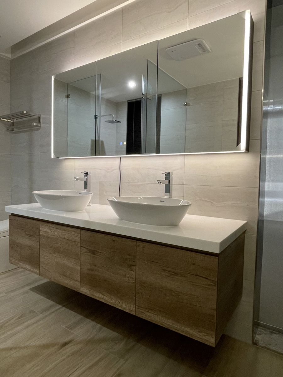 鏡櫃的魔術空間:我們強烈建議採用鏡櫃設計,這是收納牙刷、牙膏、化妝水等瓶罐的好方式。利用垂直牆面空間,將最常使用的物品隱藏在鏡子後方,讓檯面保持清爽。