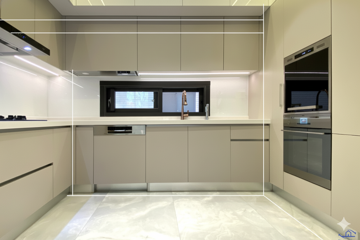 標準下櫃深度約 60公分,我們能根據您的廚房空間與備料需求,彈性調整,以創造更寬闊的工作空間、並且適應特殊電器或水槽尺寸;吊櫃深度通常建議在 37公分,我們能精準規劃深度,既能充分收納,又能避免使用者在使用檯面時造成頭部壓迫或碰撞。